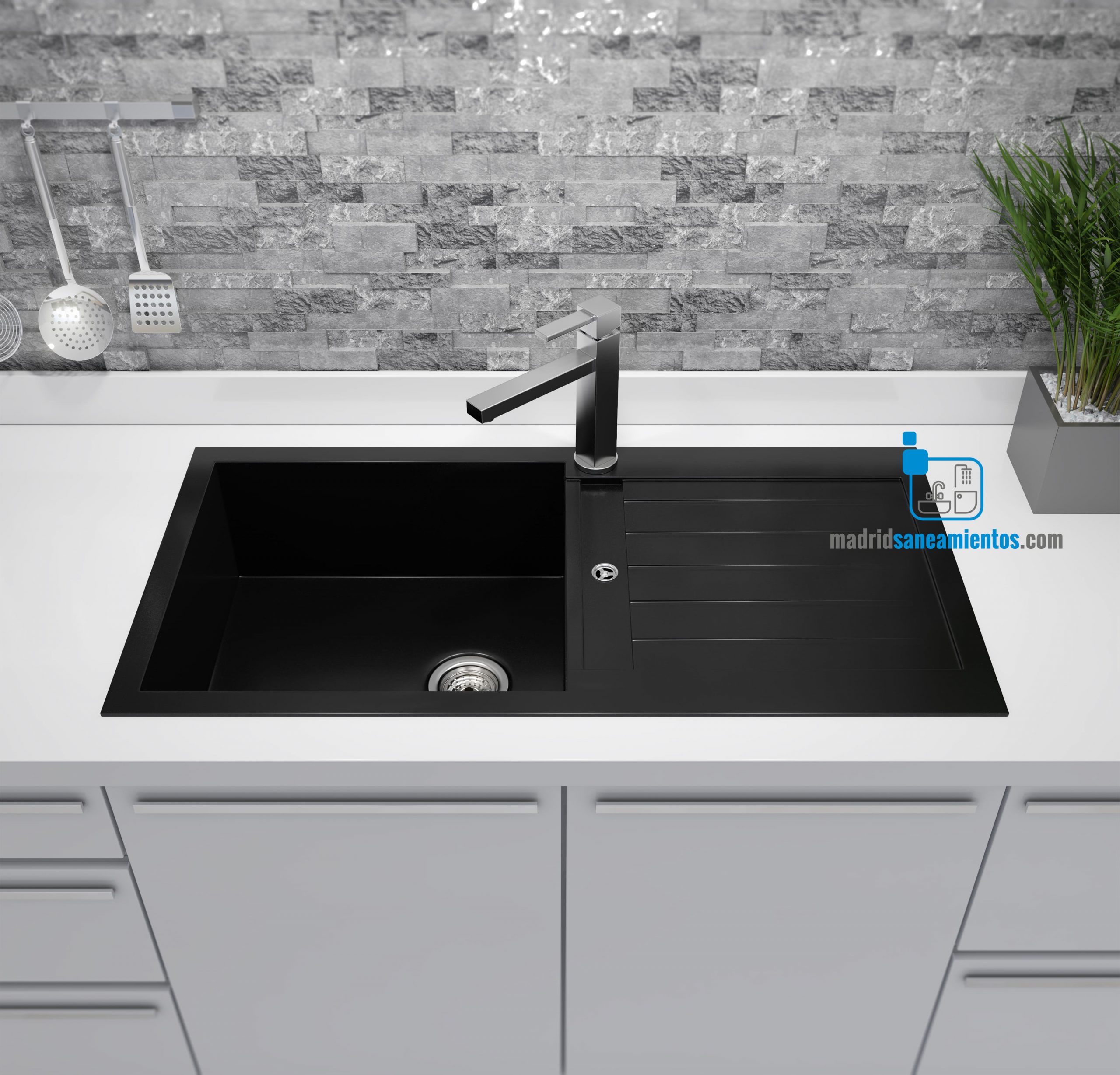 Fregadero Resina + Cuarzo fabricación COMPACTA. Alta resistencia al rayado, impacto, abrasión, choque térmico y a la temperatura. Fácil limpieza y antibacteriano. Certificación MARCADO CE (EN 13310:2003).