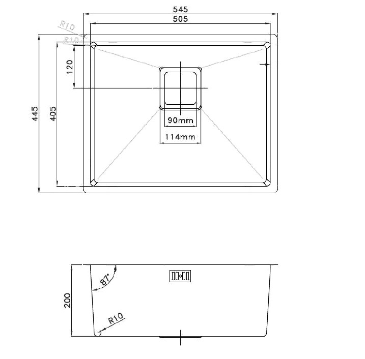 Válvula cuadrada 114 mm y rebosadero cuadrado.